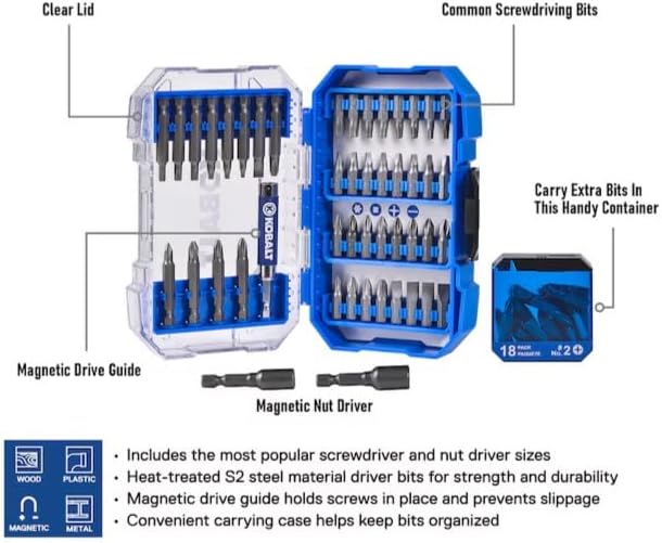 Get the right bit for every job with the Kobalt 65-Piece Screwdriver Bit Set. Designed with a durable hex shank, this versatile set is compatible with flathead, Phillips, and hex head screws, making it perfect for all your DIY, repair, and professional projects. Compact and organized, it keeps all bits within easy reach.