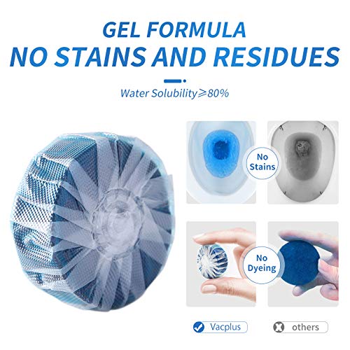 • IMPORTANT NOTES: 1) Vacplus toilet tank cleaner tablets can reduce the accumulation of dirt in the toilet but are not replacements for toilet brushes. Thus, please clean the toilet with a brush before the first use to make good use of the product. 2) When the toilet cleaner tablet dissolves completely and the blue water turns transparent, please replace it with a new tablet.