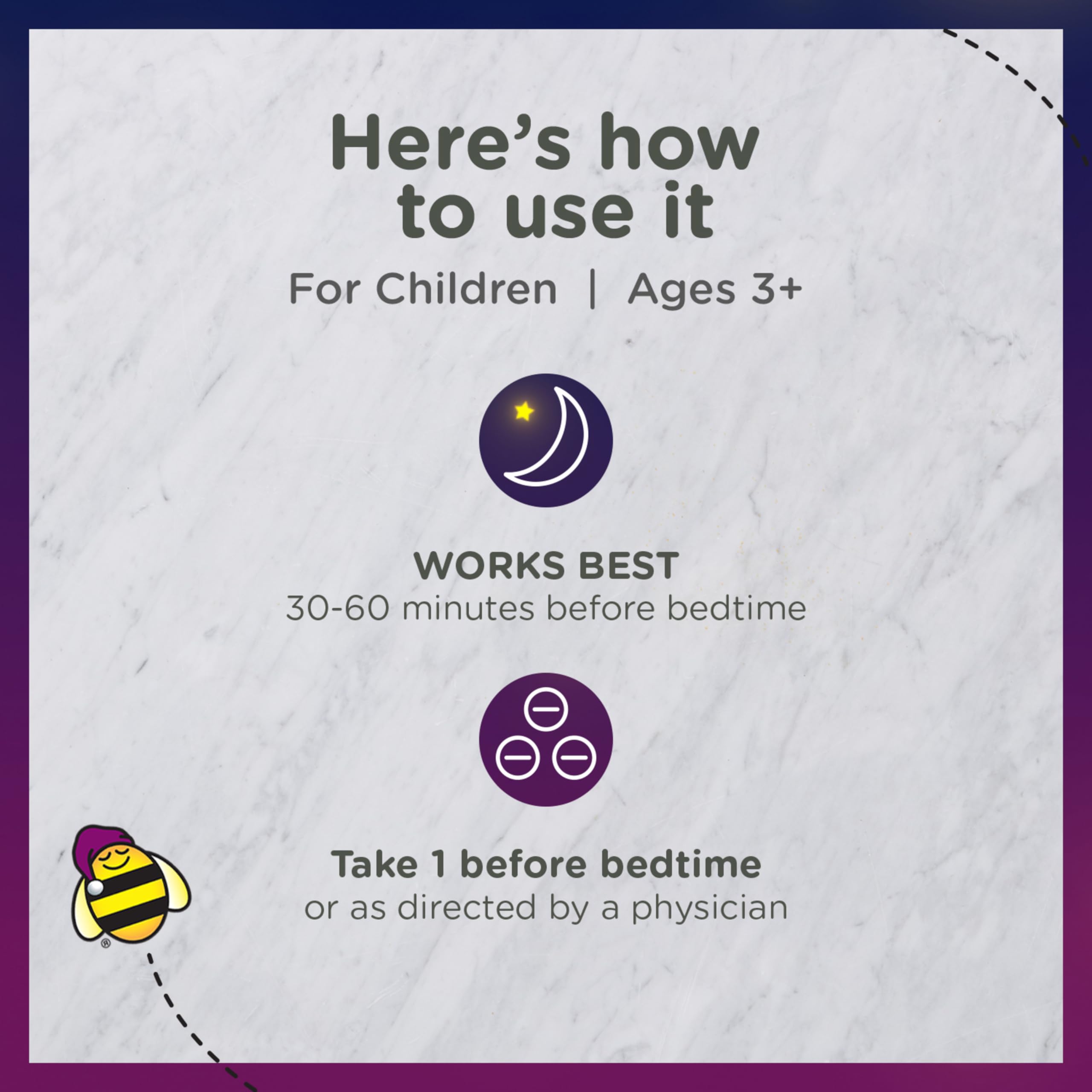 • SAFELY CATCH SOME Zzzs: Help your child’s occasional sleeplessness with our tasty; natural berry flavor; melatonin supplement. Each gummy contains 1 mg of clinically studied melatonin to help promote peaceful sleep in kids 3 years+. *